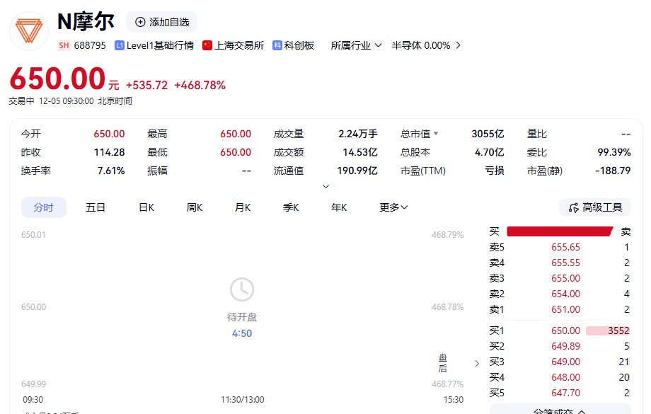 “国产GPU第一股”摩尔线程今日登陆科创板。摩尔线程开盘大涨468.78%,最新股价报650元/股,若据此计算,中一签新股可赚约26.79万元。