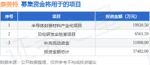 证券之星消息,北京康美特科技股份有限公司(简称:康美特)拟在上交所科创板上市,募资总金额为3.7亿元,保荐机构为广发证券股份有限公司。募集资金拟用于半导体封装材料产业化项目、贝伦研发实验室项目、补充流动资金正规股票配资官网查询,详见下表: