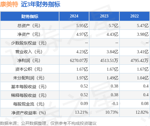 从目前公布的财报来看,康美特2024年总资产为5.95亿元,净资产为4.97亿元;近3年净利润分别为6270.07万元(2024年),4513.51万元(2023年),4795.42万元(2022年)。详情见下表: